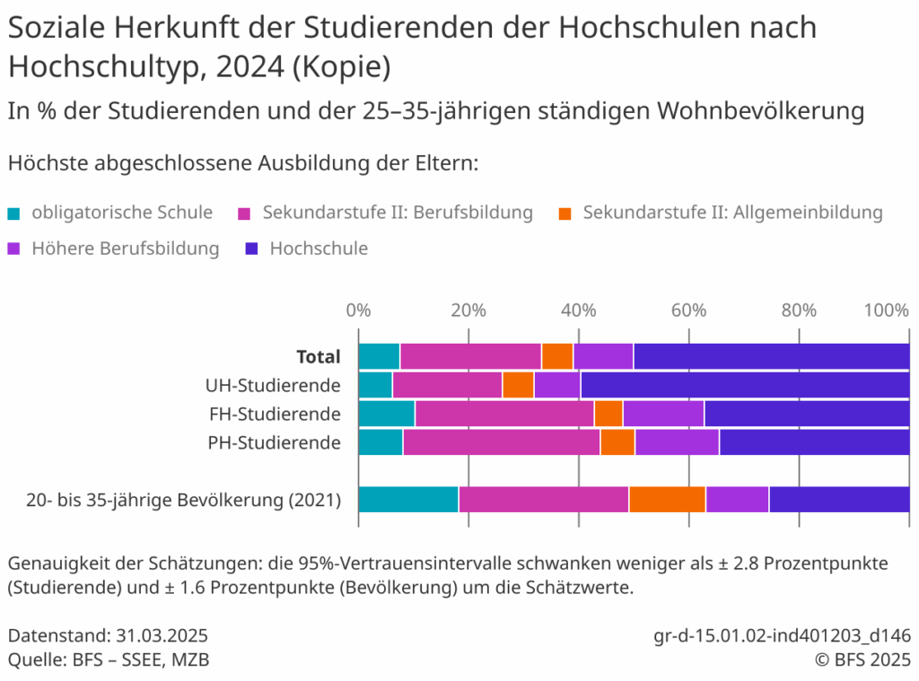 While only 25.4% of the resident population aged 20 to 35 comes from families where at least one parent has studied at a higher education institution, this proportion doubles among tertiary-level students (universities, universities of applied sciences, universities of teacher education) to reach 49.9%.